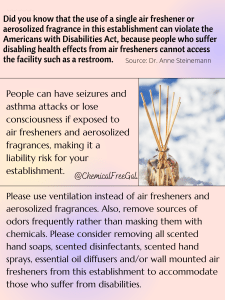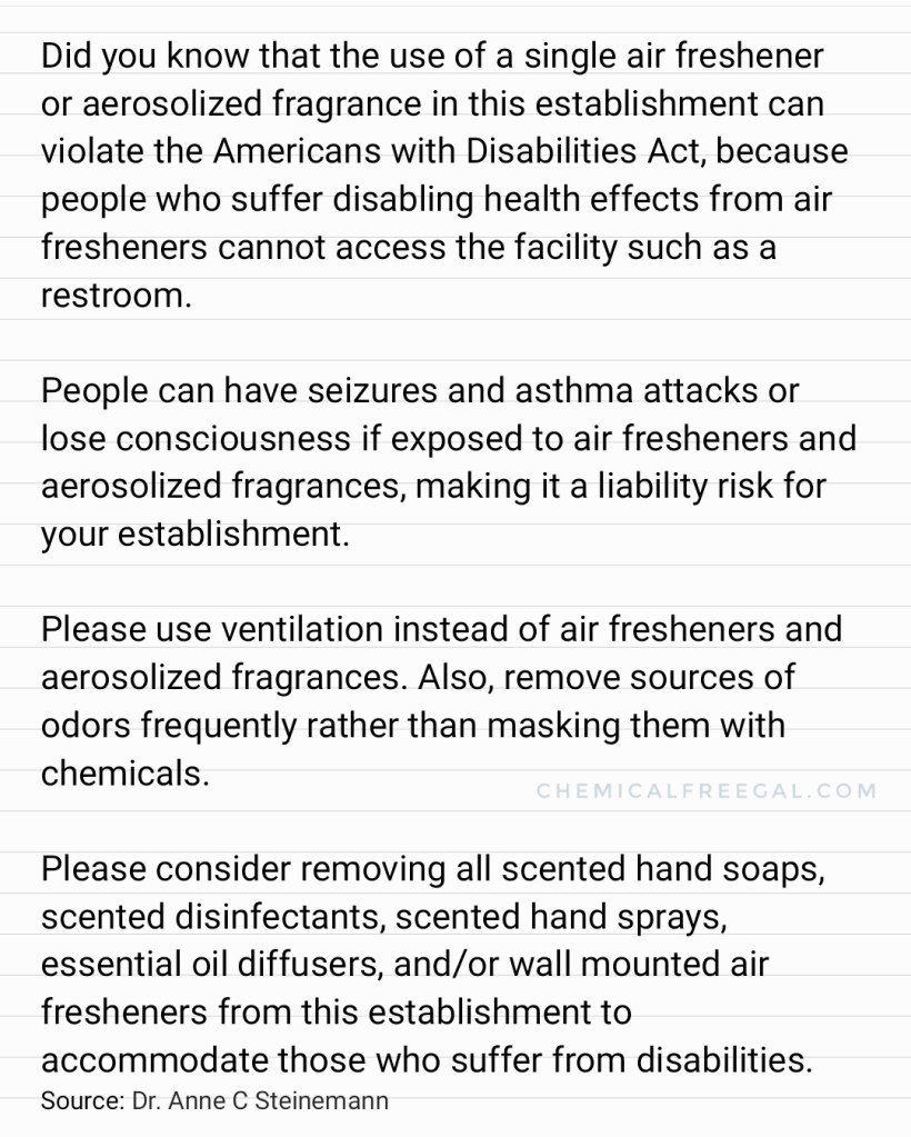 It is a violation of the ADA when you need to access medical care but cannot because the hospital and or doctors office uses air fresheners. It is also a violation of your rights as a person with a disabling illness if you are denied use of a restroom in a public setting because they use air fresheners. Employees who suffer a debilitating disability due to MCS or allergies because of fragrances in the workplace have filed lawsuits per the ADA and won. This is not to be taken lightly. Know your rights and fight for them. Click here to read about Fragrance Sensitivity being recognized as a Disability Under ADA.