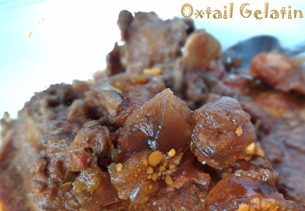 Now back to the oxtail. After you stew it you will be left with lots of yummy broth. Once refrigerated the broth will turn into gelatin due to the high collagen content in the oxtail.