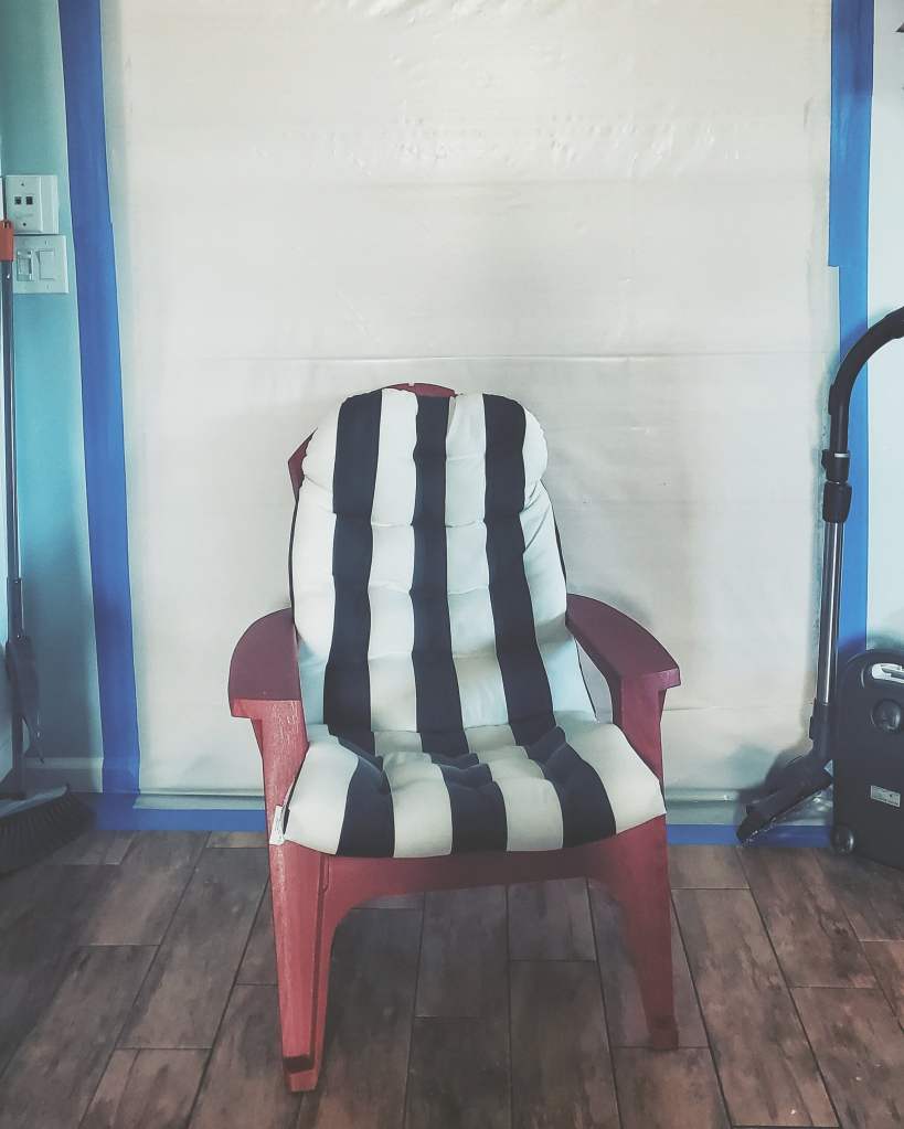 But here we are, lol. This lawn chair is our mini sofa. We have two, and we take turns using them along with four not so comfortable metal stools and two rolling chairs.