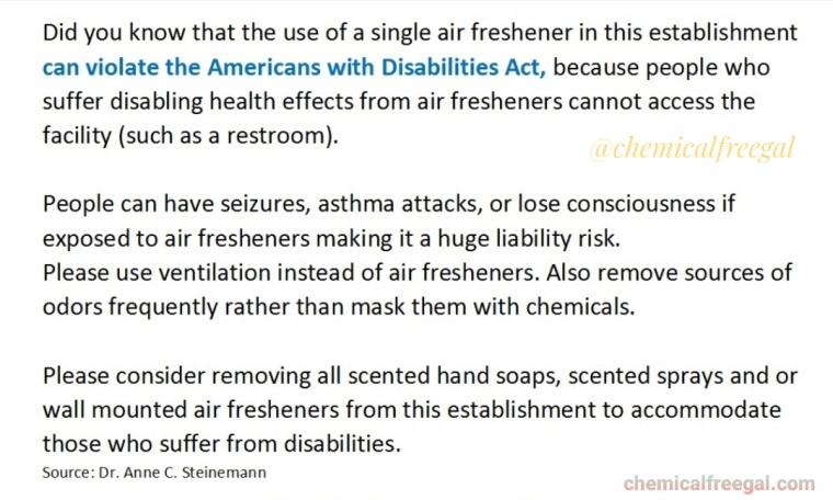 A friend and fellow fragrance-free warrior, Dr. AnneSteinemann Ph.D., said the following: “While legislation exists to protect people from secondhand smoke, the law is evolving to protect people from “secondhand scents,” or involuntary exposure to fragranced products. For instance, under the US Americans with Disabilities Act (ADA) [2], an individual who experiences disabling effects from exposure to air fresheners can request a reasonable accommodation for the air freshener to be removed or disconnected. Similar legislation and protection exist in other countries, such as in Australia under the Disability Discrimination Act (DDA) [8]. In the aforementioned surveys of the US and Australian populations, half of the health effects reported could be considered as potentially disabling under the language of the ADA and DDA.” Source
