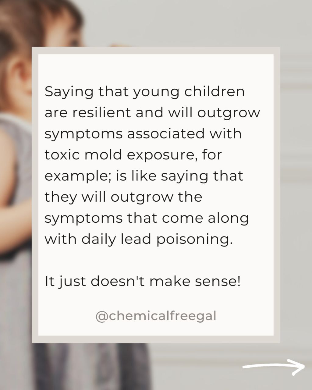 Saying that young children are resilient and will outgrow symptoms associated with toxic mold exposure, for example, is like saying that they will outgrow the symptoms that come along with daily lead poisoning. It just doesn’t make sense!